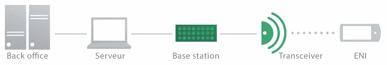 Pour piloter et mettre à jour les étiquettes numériques industrielles (ENI) , une infrastructure serveur – base station – transmetteur IR est nécessaire :